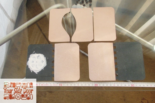さて、そんなヒグラシに励まされながら、ロゴ入りの名刺入れ作りと、同じロゴ入りのお財布の修理の模様で~す。
