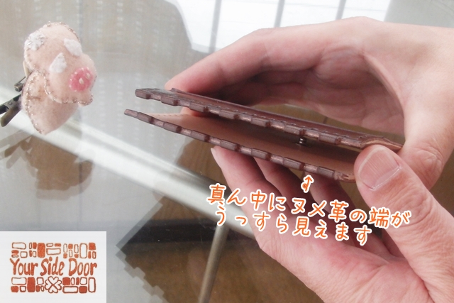 茶色と茶色の間から、薄くすいたヌメ革の端っこが見えますかね~。