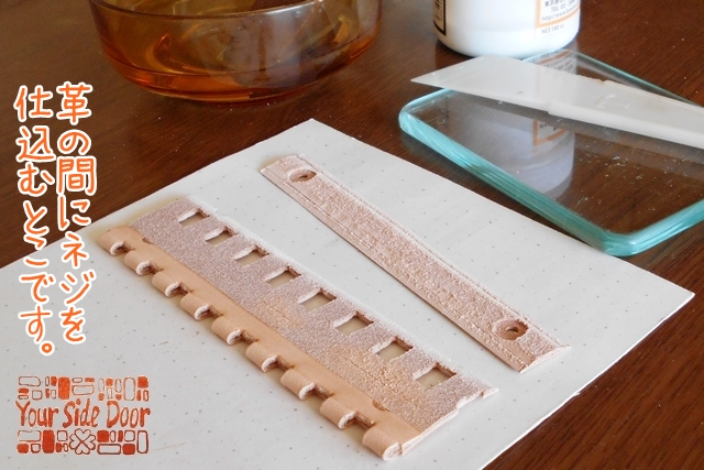 たたんだ革は元に戻ろうとしてどんどん剥がれてしまうし。