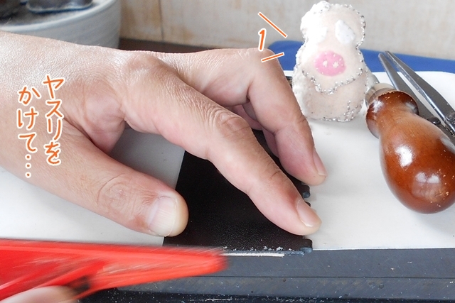 ヘリを落とししましたら、鉄のコンパスで手縫いの線をひきますよ。