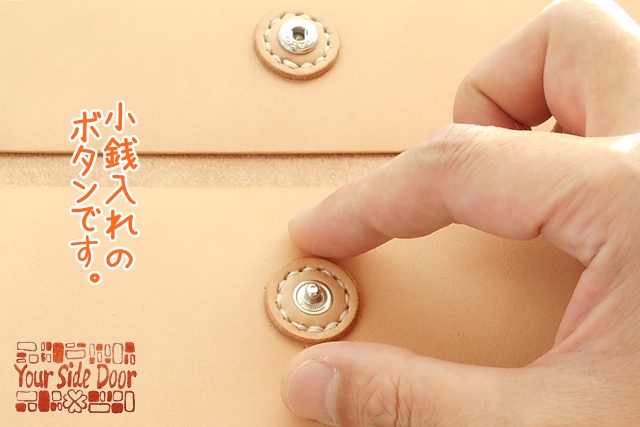 小銭入れのかぶせのホックも、アシやハンシャ(裏側の金具)は全て革で包んでます。
