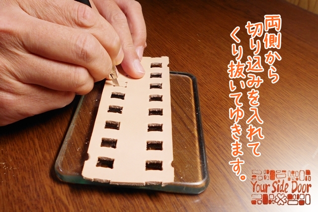 昨夜開けた穴に両側から切り込みを入れてくり抜いてゆきます。