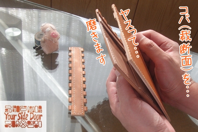 ネイビーの革の床(とこ:裏面)を磨いてます。