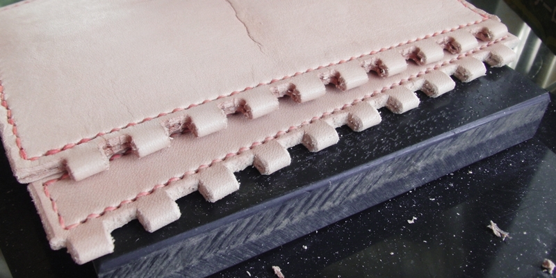 接着したレザーの裁断面を、磨いてみがいて、滑らかにしていきます。